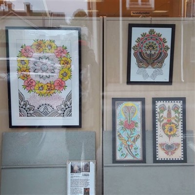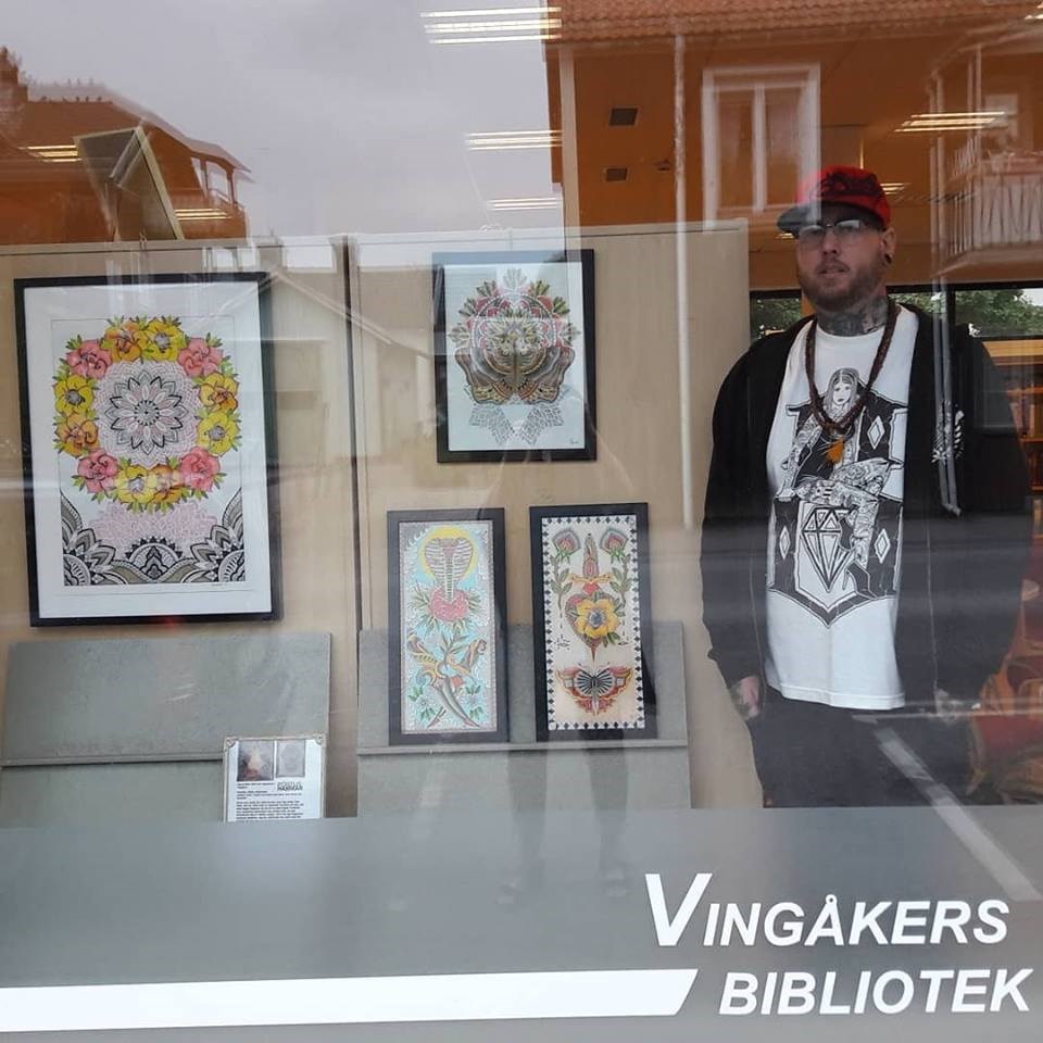 Varje månad får en av SOS-konstnärerna använda Vingåkers Biblioteks skyltfönster för att visa upp några av sina alster. På anslagstavlan vid entrén står det lite information om konstnären för denna månad.